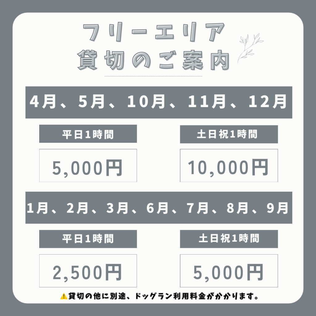 1⃣ ドッグランフリーエリアの時間貸切のご案内。スタート時間は10:00~または11:00~