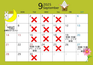 PICK UP 営業のご案内9月のカレンダー2025.08.25 この記事のタイトルとURLをコピーするいつもありがとうございます😊 9月のカレンダーです🐰🍡*9月のお休み 毎週火・水・木曜日*貸切 9/19(金)フリーエリア10:00-12:00 9/23(火)フリーエリア10:00-15:00 9/27(土)フリーエリア10:00-15:00*9/7(日) カフェbambooをご利用の際はお問合せください。⚠️予定は変更になる場合がございます。 当日お越しになる際は、Instagramのストーリーズをご確認ください。皆さまのお越しを心よりお待ちしております🐶✨ この記事のタイトルとURLをコピーする 8月のカレンダー前の記事 10月 カレンダー次の記事